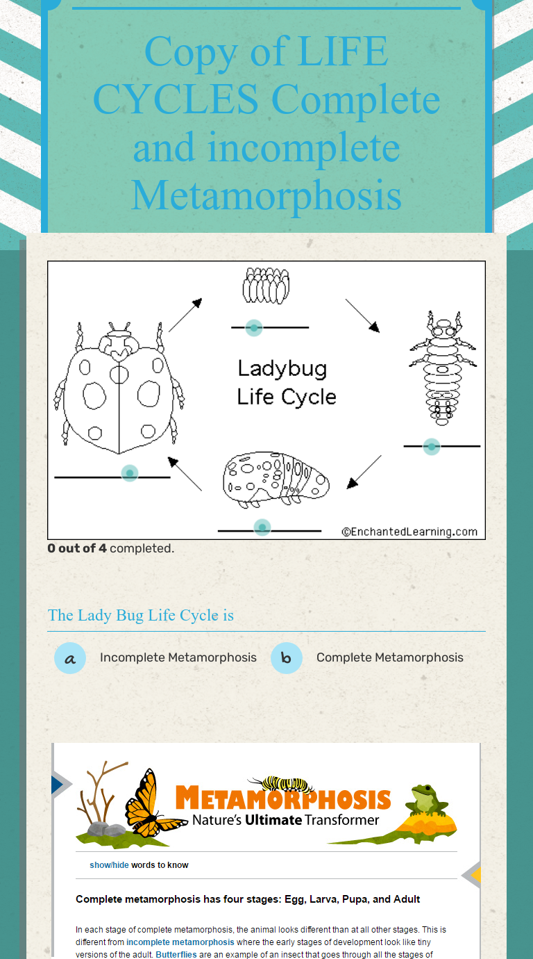 October 7, 2018 - wizer.me free interactive Life cycles, Complete Metamorphosis, Incomplete Metamorphosis, blended worksheet - LIFE CYCLES Complete and incomplete Metamorphosis by teacher Erica Rodriguez