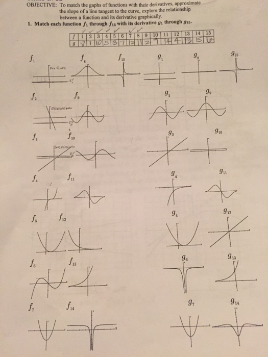 In this worksheet we want to match the graphs of functions with their deriva-tives and second derivatives. This is tougher than you might think. Here is an example: The first graph shows the function, which is here the quadratic function. The slope on the right hand side is pos-itive and increasing, on the left hand side the function is negative and de-