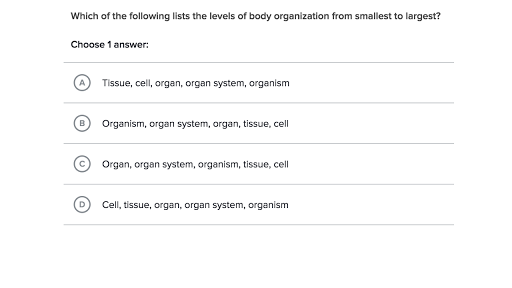 In the flow chart below, list the five levels of organization in the human body in order from simplest to most complex: organism, organ, tissue, cell, organ ...5 pages