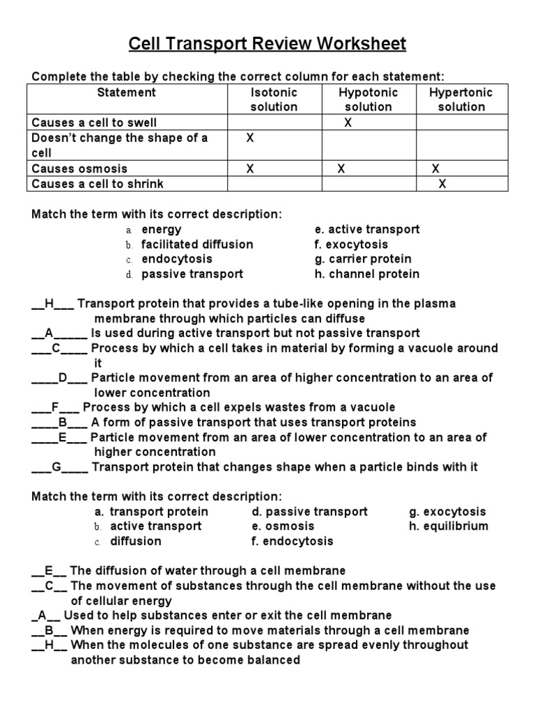 Cell transport worksheet answers.