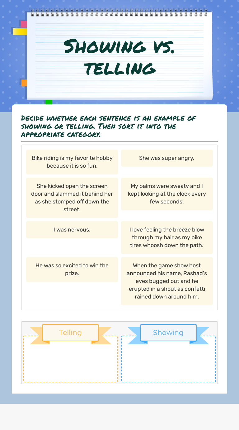 Worksheet Make a Match: Show Don't Tell Share this worksheet Did you know that strong writers show rather than tell as a part of the writing process? This worksheet asks fourth graders to match "tell" sentences to "show" sentences. By matching feelings with detailed descriptions, kids learn great examples of how to paint a picture with their words.