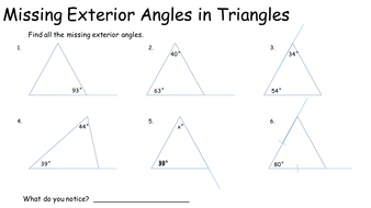 Worksheet Finding Exterior Angles of Triangles Share this worksheet Model how to find a missing exterior angle with this eighth-grade geometry worksheet! The Triangle Exterior Angle Theorem states that the measure of an exterior angle of a triangle is equal to the sum of the two opposite interior angles.
