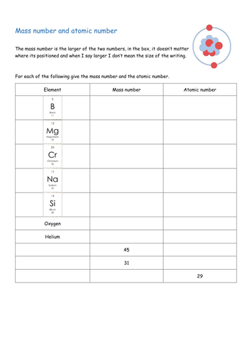 Atomic mass and atomic number worksheet key name of element symbol atomic number atomic mass protons neutrons electrons copper cu 29 64 29 35 29 tin sn 50 119 50 69 50 iodine i 53 127 53 74 53 uranium u 92 238 92 146 92 potassium k 19 39 19 20 19 lithium li 3 7 3 4 3 oxygen o 8 16 8 8 8.