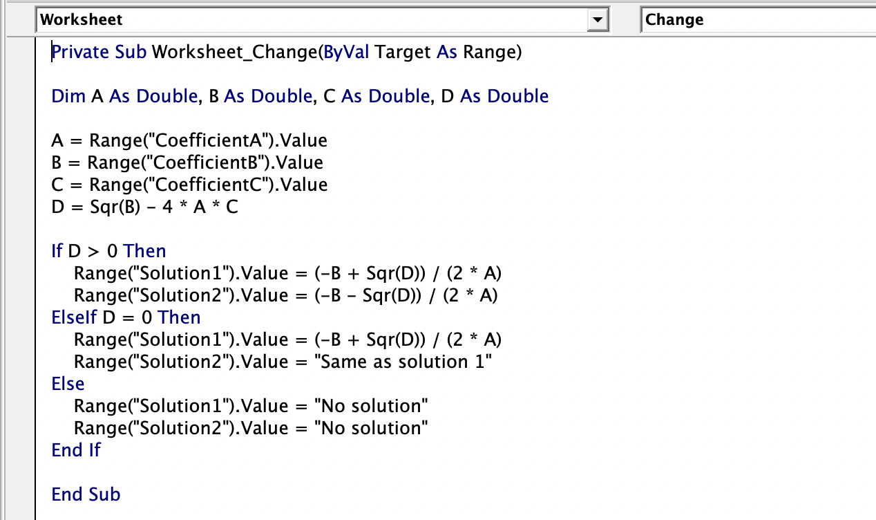 It triggers when a specified change is made. So our code is this: Private Sub Worksheet_Change (ByVal Target As Range) If Not Intersect (Target, Range ("A2:A100")) Is Nothing Then Call TestEvent End If End Sub. When you make any changes in range A2:A100 on Sheet2, the subroutine TestEvent will be called, as you can see in the gif above.