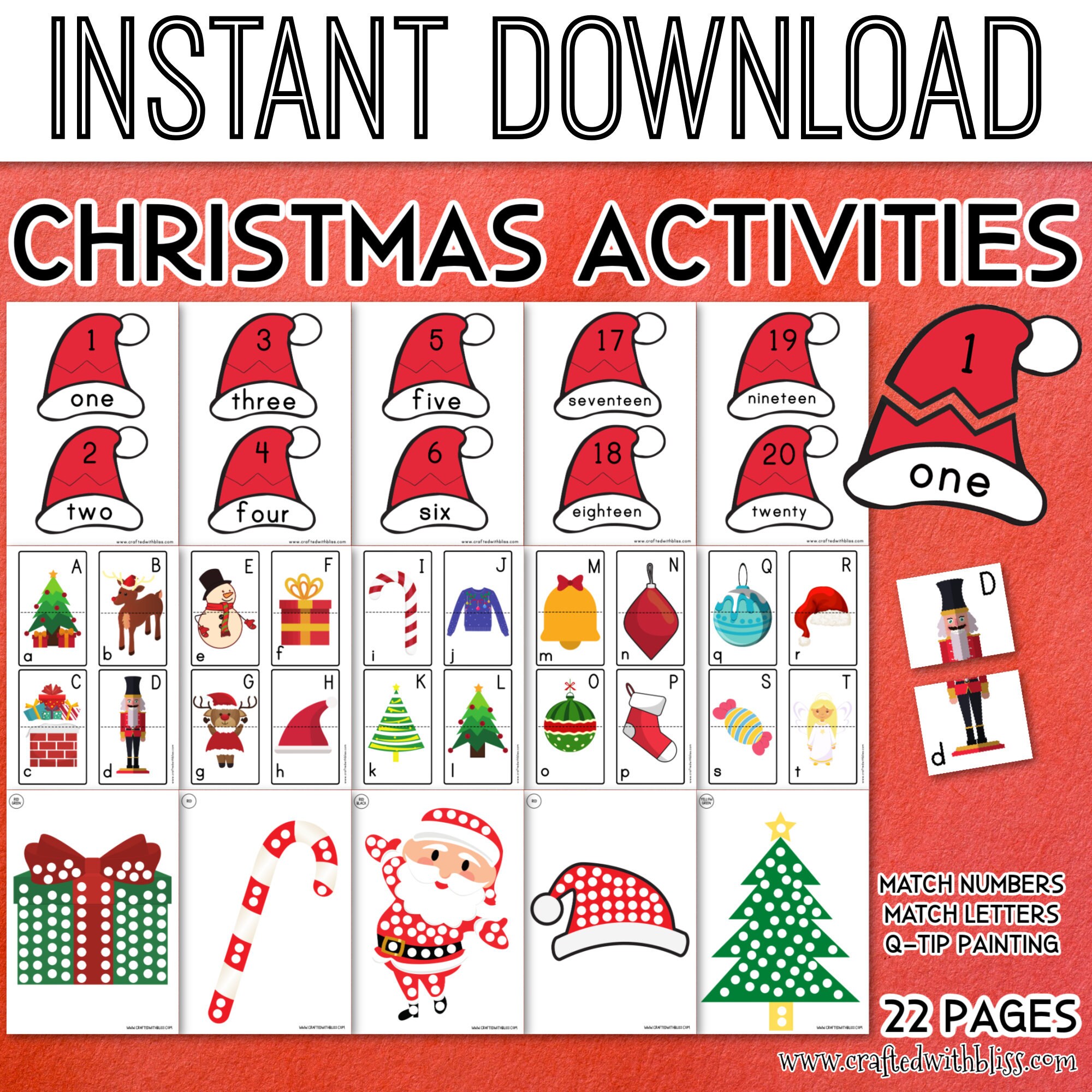 Christmas printables for kindergarten, number matching (1-20), matching of upper and lowercase letters, christmas q-tip painting