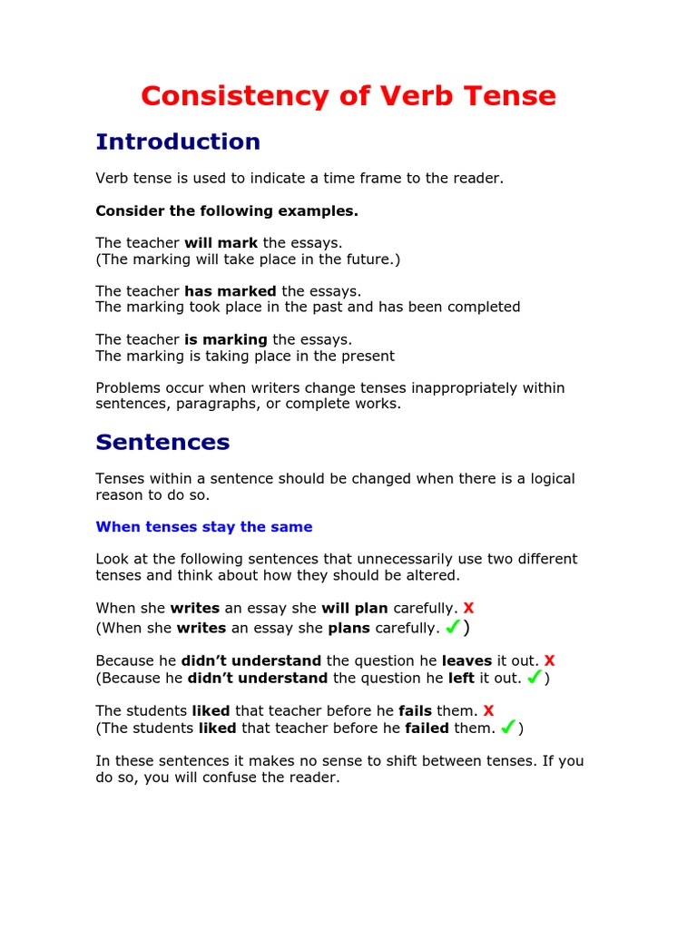 The verb tense should remain consistent throughout sentences, throughout paragraphs, and throughout the entire body of whatever you are writing—again, unless ...6 pages