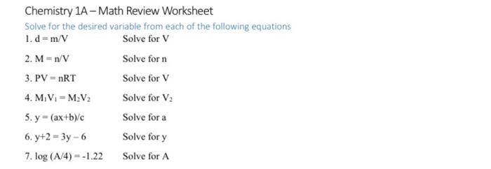 Chemistry 1A - Math Review Worksheet Solve for the desired variable from each of the following equations 1. d= m/V Solve for V 2. M=n Solve for n 3. PV = nRT Solve for V 4. M V1 = M.V. Solve for V. 5. y = (ax+b)/ Solve for a 6. y+2 = 3y - 6 Solve for y 7. log (A/4) = -1.22 Solve for A Using your scientific calculator perform the following ...