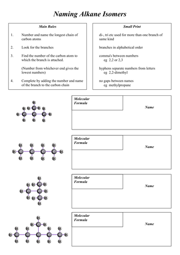 Naming alkanes worksheet. Naming and drawing alkanes for each alkane write the correct iupac name. Click on pop out icon or print icon to worksheet to print or download. Use the cycloalkane as the parent chain if it has a greater number of carbons than any alkyl substituent. A carbon bonded to a functional group must have the lowest possible ...