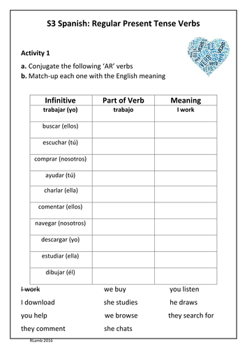 Spanish Present Tense - regular verbs. Subject: Spanish. Age range: 11-14. Resource type: Worksheet/Activity. 4.5. 55 reviews. Anyholland's Shop. 4.480638516992801 6563 reviews. MY name's Andy and I have been a teacher of MFL for the past 30 years, having taught both French and German to GCSE and A Level as well as some KS3 Spanish and GCSE ...