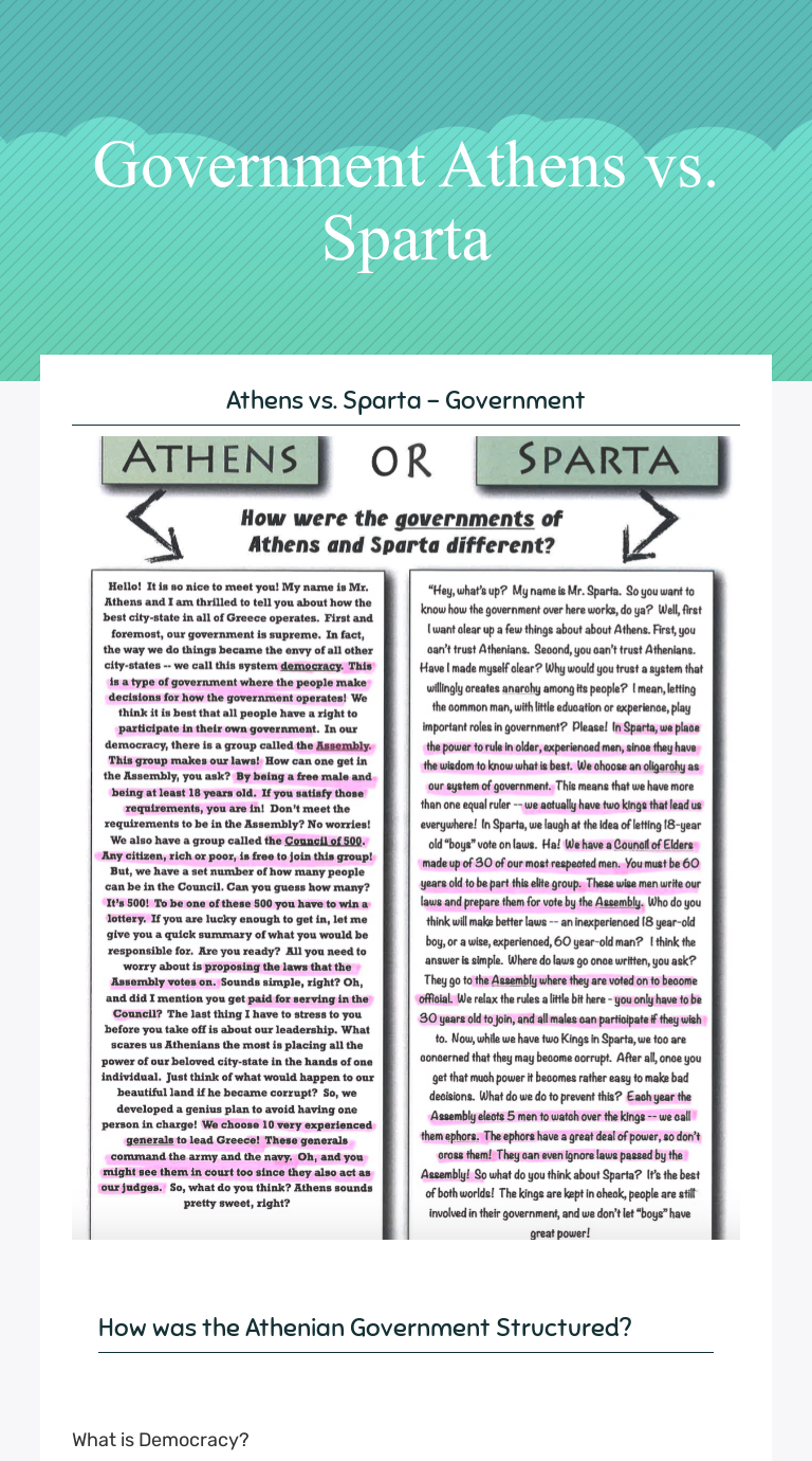 Athens vs Sparta Rap Battle. A very interactive resource that our students have enjoyed is our Athens vs. Sparta Rap Battle. There are full reading passages on each city-state included, and students conduct research to prepare a rap, song, or poem. This activity allows students to shine and get creative while being able to identify those ... These are ready-to-use Athens Versus Sparta worksheets that are perfect for teaching students about the Athens and Sparta which are both famous and prosperous cities in Ancient Greece, which have also rivaled each other for years. They are just 95 miles away from each other, but their differences were vastly noticeable. The difference between Athens and Sparta is:SParta is a oligarchy.Athens is a direct-democracyOne difference between the city-states of Athens in Sparta was that Sparta was ruled by a king while... Explore more than 10,000 'Athens And Spart Powerpoint' resources for teachers, parents and pupils