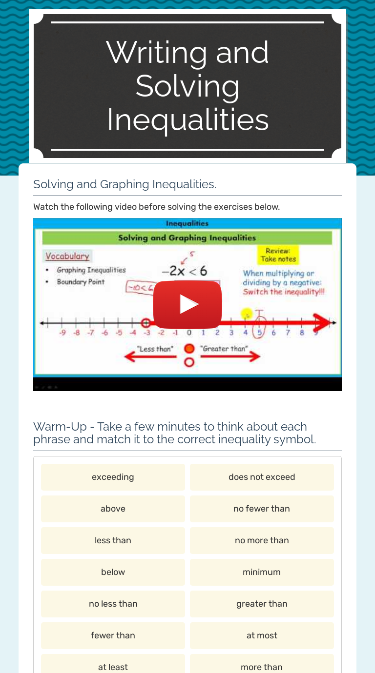 12. jan. 2021 ... Wizer.me free interactive worksheet - Writing and Solving Inequalities by teacher T-awannda Piper.