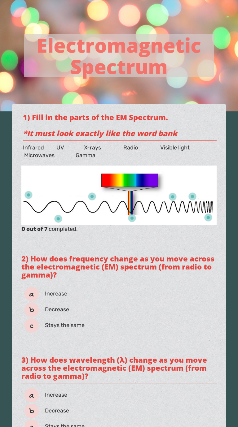 Electromagnetic spectrum worksheet pdf. Gamma ultraviolet visible x rays microwaves infrared radio tv. Electromagnetic spectrum infrared waves radio waves wavelength frequency microwaves ultraviolet rays x rays use your notes or textbook and the terms in the vocabulary box to fill in the blanks for the following nine questions. The ...