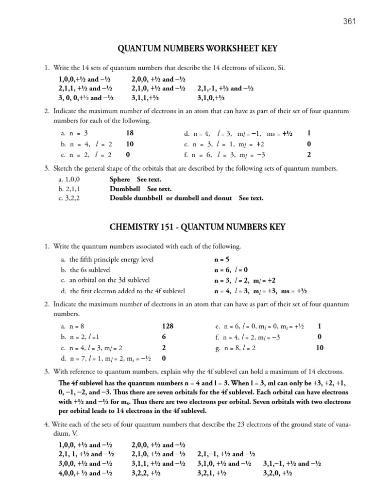 This quiz/worksheet combo allows you to check what you know about electron configurations and the four quantum numbers. You must apply your knowledge of Madelung's rule and understand the structure... Quantum Numbers Worksheet - On this practice worksheet, students determine the noble gas configurations, draw orbital diagrams, find the quantum numbers for the last electron and complete lewis structures. This worksheet is organized and formatted to help students understand the process of finding Subjects: Chemistry, Physical Science, Science