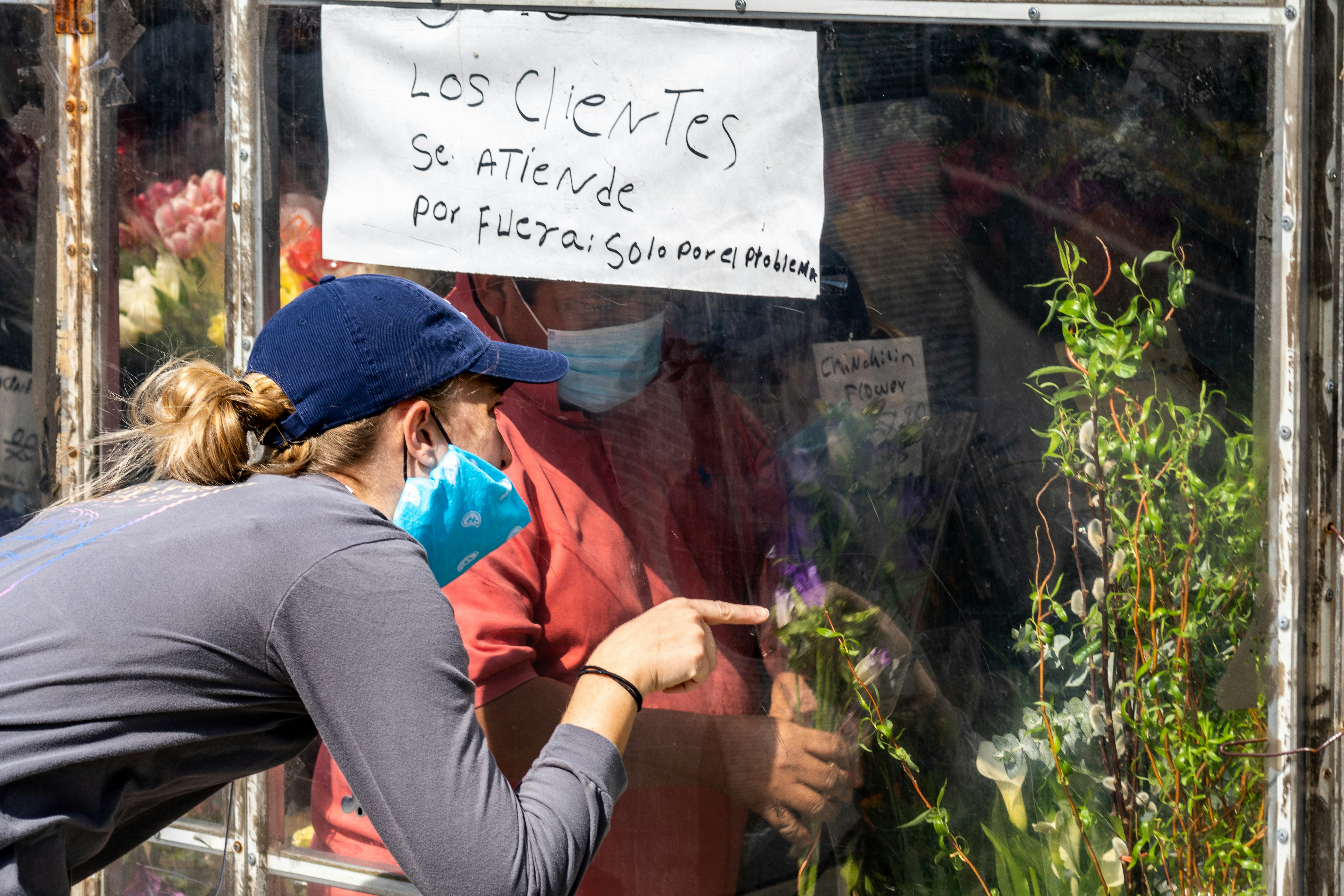 Woman buys flowers during coronavirus quarantine in Park Slope, Brooklyn. The sign directs customers to shop through the window due to the pandemic.