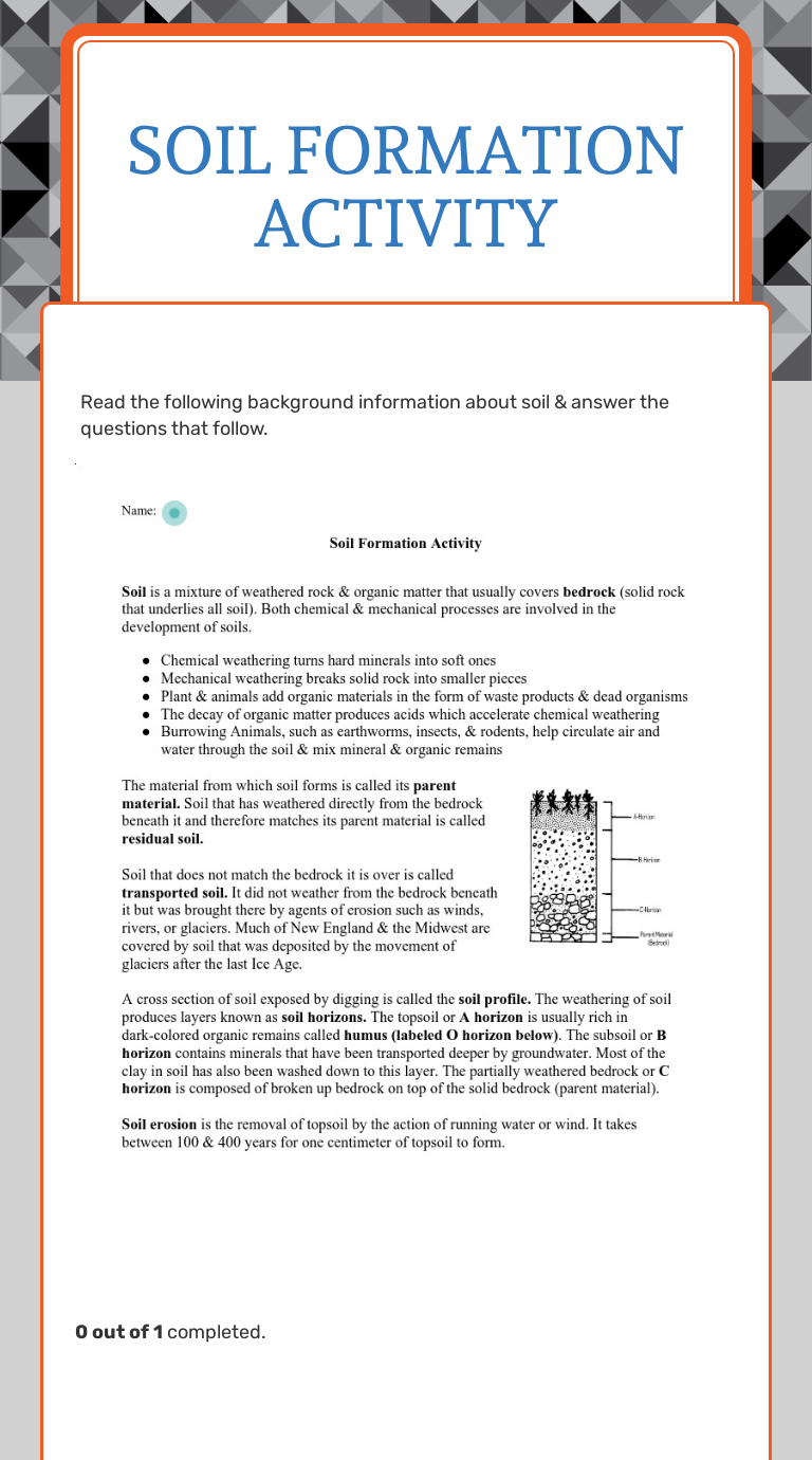 LB Q R W Largest 0.05 to 2 mm (visible to the eye) Mid-sized 0.002 mm to 0.05 mm (may need a microscope to see) Smallest Less than 0.002 mm (will need a microscope to see) Has large spaces between the particles allowing water to slip ... Soil worksheet 3.qxp Author: MGarnett Created Date: Start studying Chapter 7 7.3 Soil Formation. Learn vocabulary, terms, and more with flashcards, games, and other study tools. There are different types of soil, each with its own set of characteristics. Dig down deep into any soil, and you’ll see that it is made of layers, or horizons (O, A, E, B, C, R). Put the horizons together, and they form a soil profile. Like a biography, each … In a tropical climate, (sandy soil, clayey soil, humus) develops. 14. Many plants produce (carbonic acid, tannic acid, rust), which causes weathering in rocks. Weathering and Soil Formation Meeting Individual Needs 1 Reinforcement