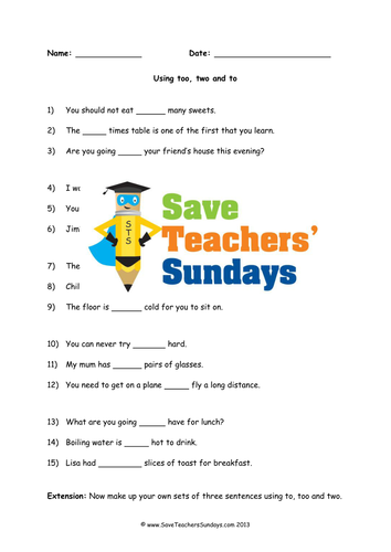 Commonly mistaken, students are asked to write to, too or two in sentences in these worksheets. to: toward a point, person, place or thing; too: also; two: a number, 1 plus 1. Open PDF. Worksheet #1 Worksheet #2 Worksheet #3 Worksheet #4 Worksheet #5 Worksheet #6.
