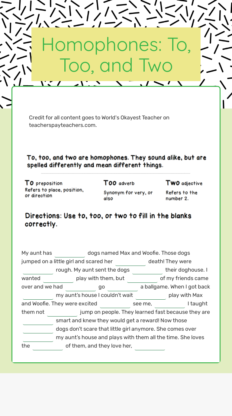 Homophones Worksheet: Using To, Too, and Two Correctly by Elly Thorsen 23 $1.75 PDF This two page worksheet gives students practice using to, too, and two correctly. It can be used with a variety of grades or for English Language Learners. A complete key is included.The worksheet has four parts. To, Too, Two - Explained. By Zak Hall - English Grammar. To, Too, Two - Explained "I'm going to the shops for two tomatoes too." This is a rather confusing sentence to read as I'm sure you agree! It is, however, an easy one to say. The words "to", "two" and "too" sound the same in this example. The problem is that they are ... To, too, and two printable worksheets. The words too, to, and two all sound the same, but mean something different.Too means also, two is the number, and to shows a specific person, place, thing, or goal. Worksheet To, Too, or Two? Share this worksheet To, too, or two? Children will practice using context clues as they identify the correct homophone in this grammar and spelling worksheet. Learners will review the definition of "to," too," and "two," then fill in each of ten sentences with the correct word.
