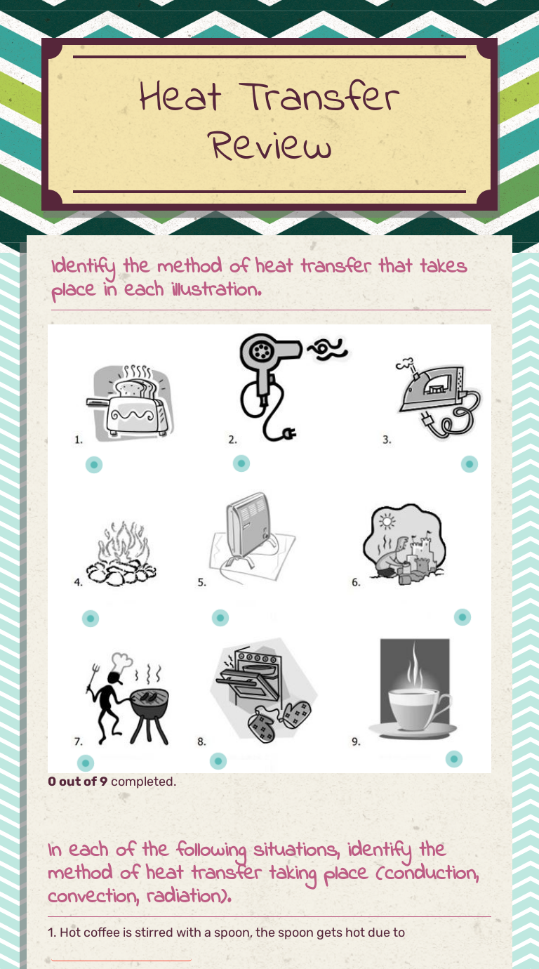 Thermal Energy Transfer | Interactive Worksheet by... | Wizer.me Thermal Energy Transfer Worksheet. April 2, 2020. Impact. Convection transfers thermal energy through the of particles in a or . The movement of the heated material carries energy from the heat source.