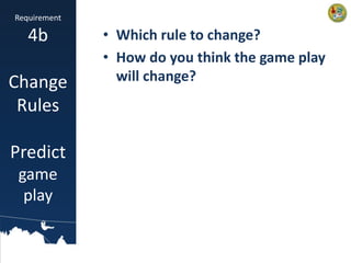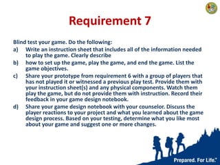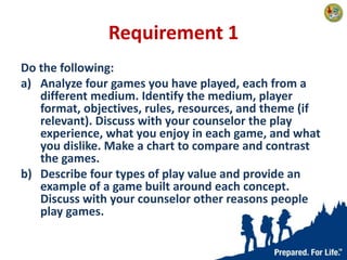 Play to win: Game Design merit badge released - Bryan on Scouting Game Design merit badge requirements. 1. Do the following: a. Analyze four games you have played, each from a different medium. You must have your merit badge counselor's approval of your concept before you begin creating the prototype. b. Test your prototype with as many other people as...