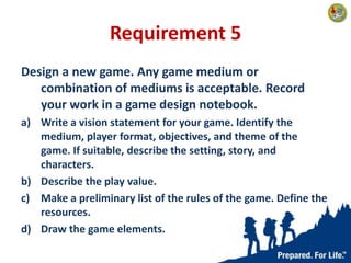 BSA Game Design Merit Badge Record your work in a game design notebook. • Write a vision statement • Identify the medium, player format, objectives, and theme. You must have your merit badge counselor's approval of your concept before you begin creating your prototype! 34. Prototype An early version of a game, section...