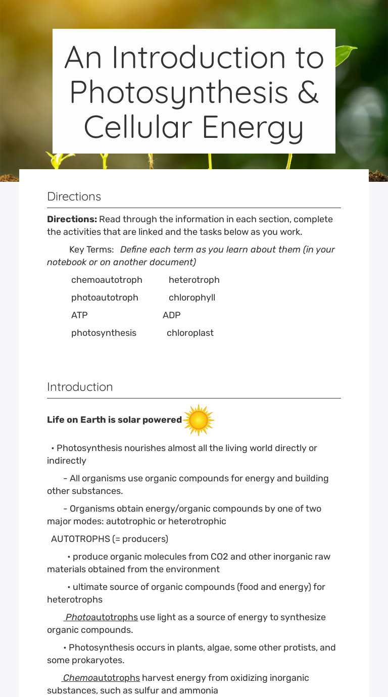 How Cells Harvest Chemical Energy Flashcards | Quizlet Start studying How Cells Harvest Chemical Energy. Learn vocabulary, terms, and more with flashcards, games, and other study tools. Photosynthesis Making Energy Worksheet Answers - Energy ... Photosynthesis Making Energy Worksheet Answers It is our objective to make studying & passing on understanding a pleasurable experience for both trainees and teachers. You and also your pupils can benefit from a variety of academic resources, consisting of those centered on mathematics, Grammar skills, science, as well as basic understanding. Chapter 9 Cellular Respiration Harvesting Chemical Energy ... Chapter 6: How Cells Harvest Chemical Energy 7. The overall chemical equation for cellular respiration is: C 6H 12O 6 1 6O 2 → → → → 6CO 2 1 6H 2O Briefly explain why the equation has multiple arrows. 8. CO 2 is a gaseous by-product of cellular respiration that you exhale with each breath. Briefly … Biology Chapter 6: How Cells Harvest Chemical Energy ... The aerobic harvesting of energy from food molecules; the energy-releasing chemical breakdown of food molecules, such as glucose, and the storage of potential energy in a form that cells can use to perform work; involves glycolysis, the citric acid cycle, and oxidative phosphorylation (the electron transport chain and chemiosmosis).