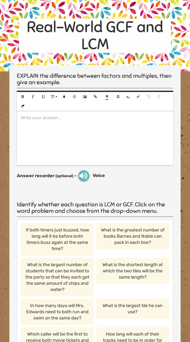 GCF/LCM Word Problems | Interactive Worksheet by... | Wizer.me GCF/LCM Word Problems. As 100 students entered the auditorium they were each given a prize. To play a certain game, the students must form teams. Each team must have the same number of boys and girls. What is the greatest number of teams Mrs. Andrews can make if every student is on a team?