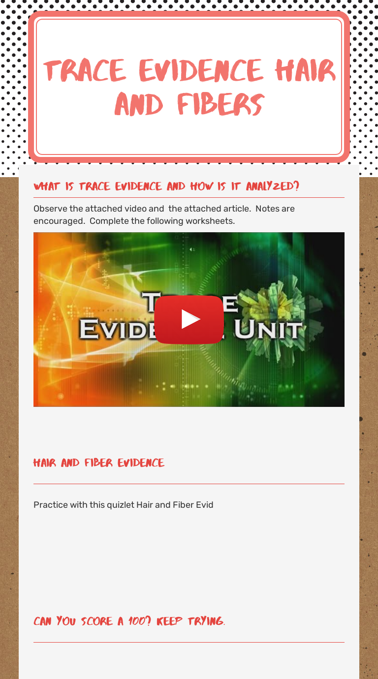 Fiber Evidence Worksheets & Teaching Resources | TpT The Forensics: Hair and Fiber Evidence Packet includes a PowerPoint with embedded video clip links, illustrated Student Guided Notes, Teacher Notes, Worksheet with Answers, and a Hair Activity. The PowerPoint is fully editable. The Notes & Worksheets are editable Word Docs too. This will allow y