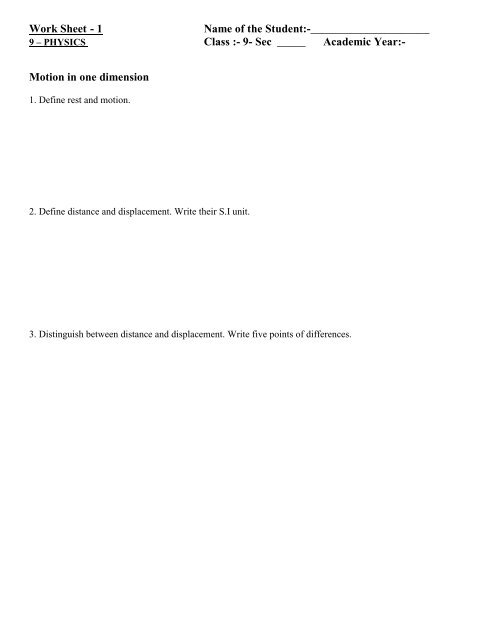 ICSE Worksheet for chapter-4 Motion in One Dimension class ... Physics Worksheet - 4. TOPIC: Motion in One Dimension. For other ICSE Worksheet for class 9 Science check out main page of Entrancei. SUMMARY • REST AND MOTION, DISTANCE AND DISPLACEMENT • SPEED AND VELOCITY, ACCELERATION AND RETARDATION • MOTION UNDER GRAVITY, UNIFORMLY ACCELERATED MOTION. SECTION 1 - OBJECTIVE. 1.