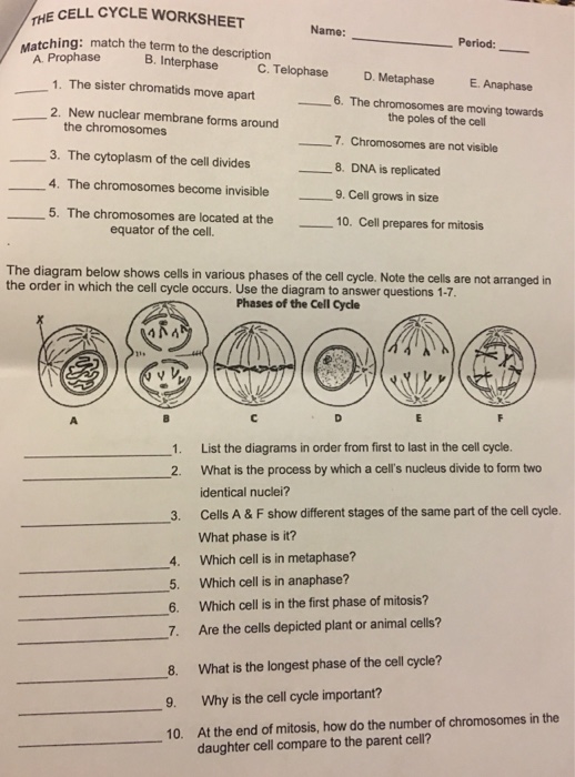 PDF Biology Name: Period: Mitosis Worksheet The diag Period: Mitosis Worksheet. The diagram below shows six cells in various phases ofthe cell cycle. Note the cells are not arranged in the order in which mitosis occurs and one ofthe phases of mitosis occurs twice. Use the diagram to answer Phases of the Cell Cycle.