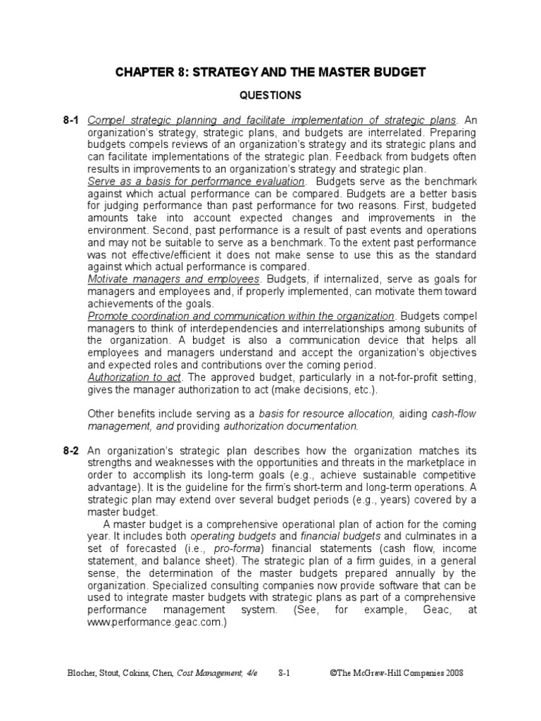 PDF Chapter 8 Solutions Manual, Chapter 8 1 Chapter 8 Master Budgeting Solutions to Questions 8-1 A budget is a detailed quantitative plan for the acquisition and use of financial and other resources over a given time period. Budgetary control involves using budgets to increase the likelihood that all parts of an organization are