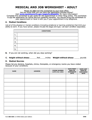 PDF Medical and job worksheet - adult This worksheet is not the application for Social Security disability benefits. You should bring this worksheet to your appointment or have it with you if your A. Medical Conditions List all of the physical or mental conditions (including emotional or learning problems) that limit your ability to work.
