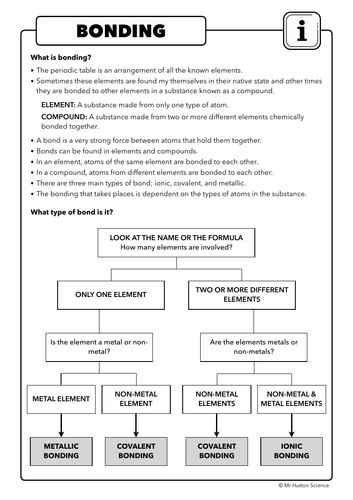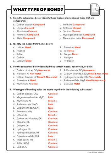 Chemical Bonding (Worksheet) - Chemistry LibreTexts Chemical bonds are the attractive forces that hold atoms together in the form of compounds. A chemical bond is formed when electrons are shared Hydrogen atoms are only able to form one bond to other atoms so we need to put the oxygen atom in the center. Step 3: The next thing that you must... covalent bond notes worksheet.pdf - Pearland ISD Covalent Bonds. -. Occurs between 2 or more nonmetals ... Worksheet: Introduction to Bonding. Name. For each of the following statements, write "I" for ...4 pages Bonding-Introduction to Bonding | Interactive Worksheet... | Wizer.me Bonding-Introduction to Bonding Worksheet. November 30, 2020. Impact. Match the type of bonding with the correct definition. Write question here... Instructions (Optional).