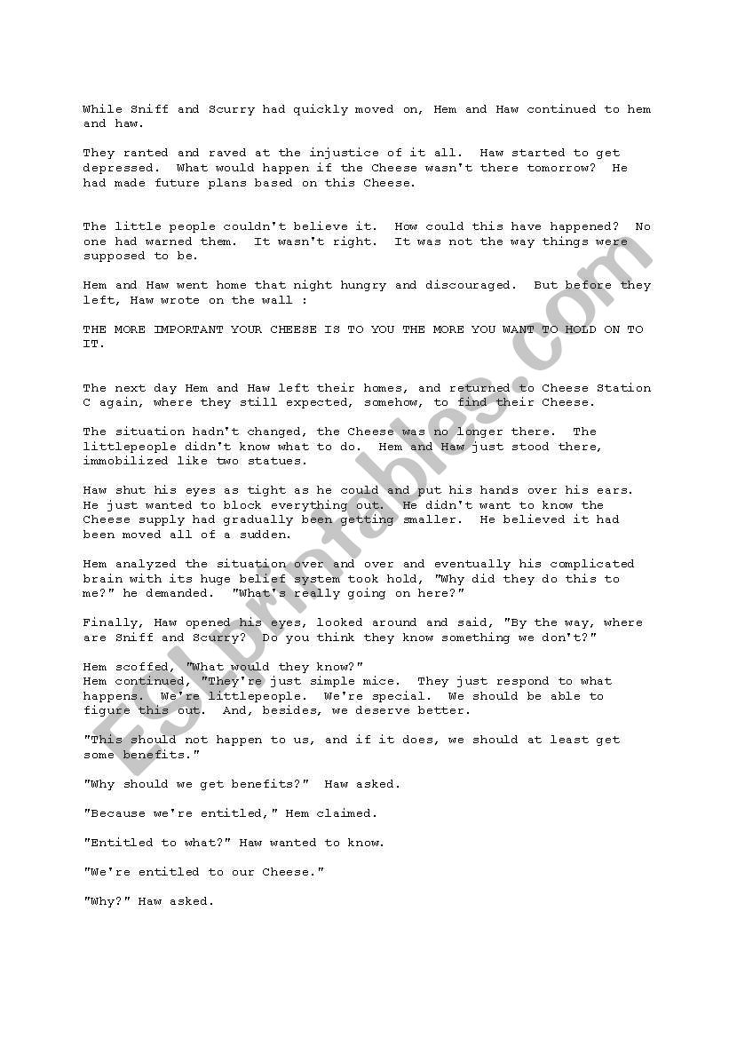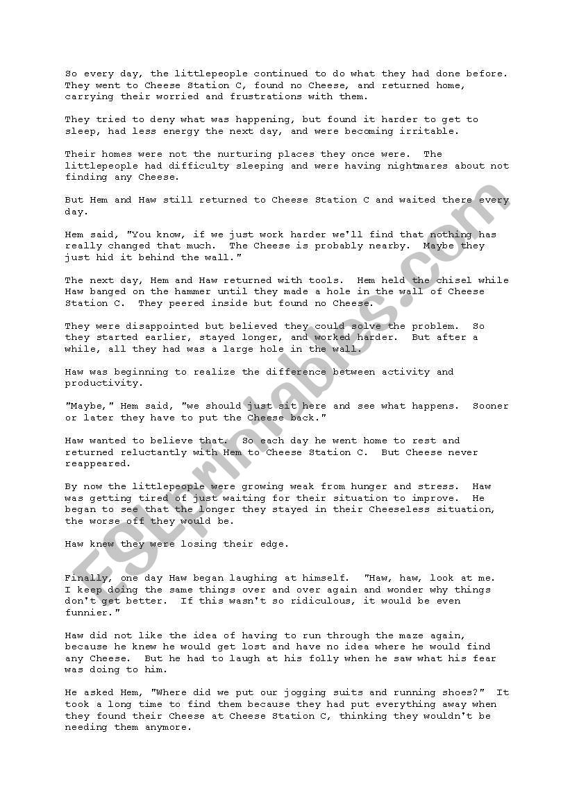 Who moved my cheese worksheet. Who Moved My Cheese? : An a-Mazing Way to Deal with... | eBay ...business classic, Who Moved My Cheese? uses a simple parable to reveal profound truths about dealing with change so that you can enjoy less stress and more Exploring a simple way to take the fear and anxiety out of managing the future, Who Moved My Cheese? can help you discover how to... Who Moved My Cheese? Word Search - WordMint CHEESE This is the feeling the little people had that made it hard for them to leave the station that they thought would always have cheese. HEM The author of the story "Who Moved My Cheese?" JOHNSON This is what the characters are in and is supposed to represent the different paths life has. Who Moved the Cheese Worksheet - Scanned by... | Course Hero View Homework Help - Who Moved the Cheese Worksheet from BSNS 160 at Olivet Nazarene University. Scanned by CamScanner. THE LONGEST TEXT EVER(I think) never mind that noise my dear can anyone pass the cheese only if you say pretty please oh, boy do I have to sneeze. why must everyone always rhyme, why I’m a poet and don’t I know it? what I fear comes right after here not this life or the next will I ever be able to pass the test? we’re stuck in here, (alone my dear) and we’ll problem never get out so don’t start to shout. it’s ...