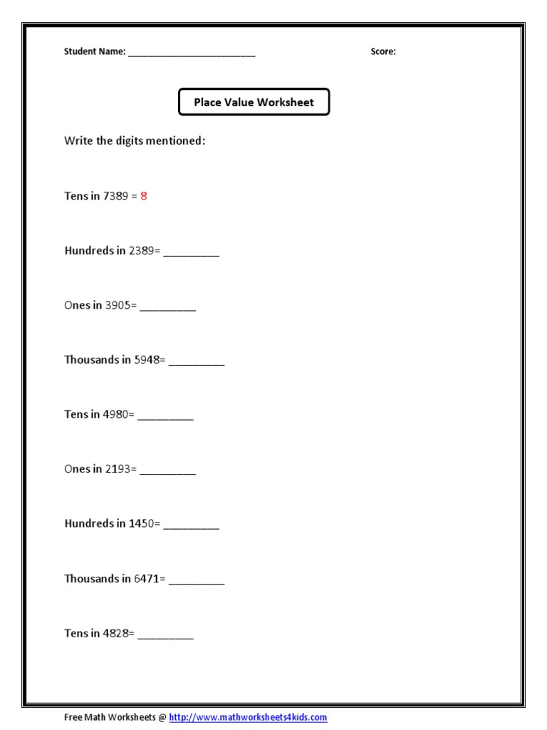 Place Value Worksheets for Grade 3 [With PDF] - Practice Worksheet Place value indicates the value of the digits in the given number. For Example, In the number 3249, the value of the digit '4' is 40 and '3' is 3000. Here we mention 50+ crucial place value worksheet questions that will benefit the students of Grade 3.