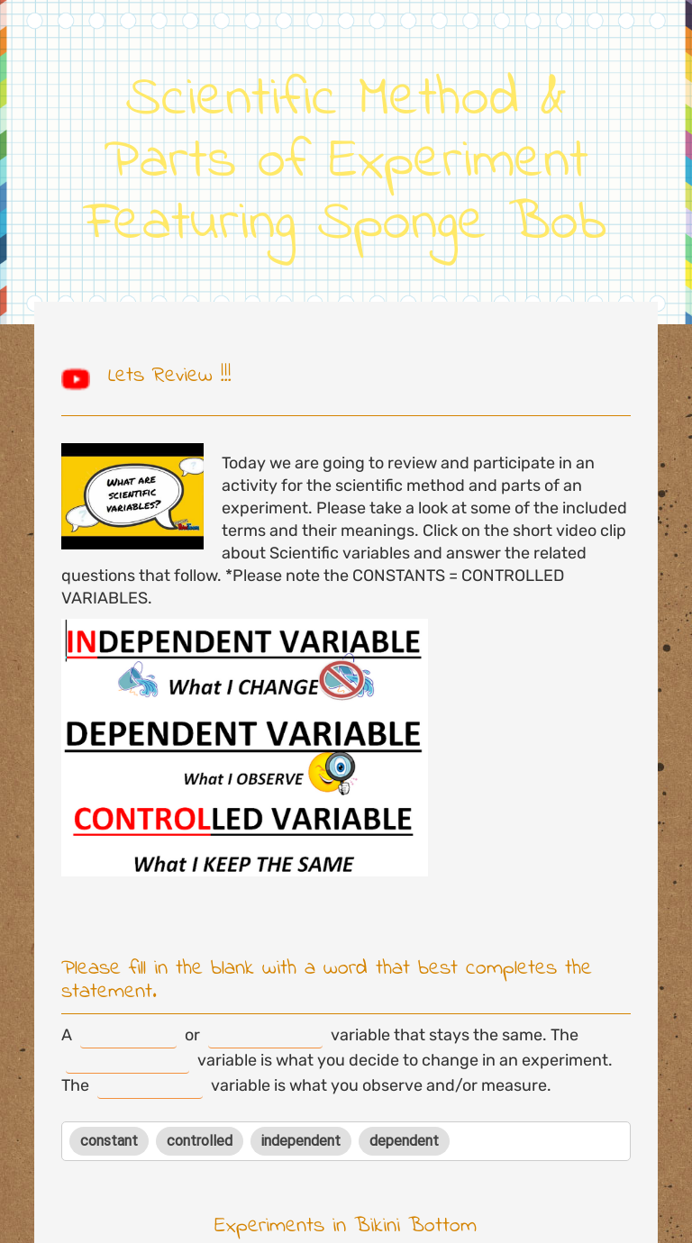 Scientific Method Worksheet - SpongeBob Key Scientific Method: Controls and Variables – Part 1 Name: _____ SpongeBob and his Bikini Bottom pals have been busy doing a little research. Read the description for each experiment and answer the questions. 1 – Patty Power Mr. Krabbs wants to make Bikini Bottoms a nicer place to live. He has created a new sauce that he