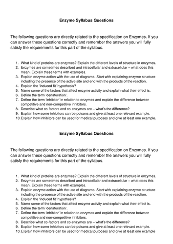 Bio Enzymes Worksheets Answers | Biology activity, Biology ... High School Biology: Enzyme Worksheet Pack Description This High School Biology resource pack covers the key concepts associated with the enzyme topic. The resources are designed to be visually appealing to students and can be worked through independently. Each worksheet should take approximately 10-15 minutes to complete. Enzyme Worksheet answers.pdf - Biology 12 Enzymes Mr. Al ... View Enzyme Worksheet answers.pdf from BIOLOGY Into to bi at Canterbury High School, Ottawa. Biology 12 Enzymes Mr. Al-Chalabi Worksheet 1. Name two environmental factors that can change the shape GCSE Biology (9-1) - Digestive Enzymes - Worksheet ... GCSE Biology (9-1) - Digestive Enzymes - Worksheet. Here are a list of our available resources. If they are any help, please share with anyone that might also benefit :) This worksheet explores where digestive enzymes are made, what they breakdown, and what they produce. Quiz & Worksheet - Biology Lab for Enzyme Activity | Study.com Print Enzyme Activity: Biology Lab Worksheet 1. Which answer correctly matches two vocabulary terms associated with biochemical reactions with the substances used in this lesson's laboratory activity?