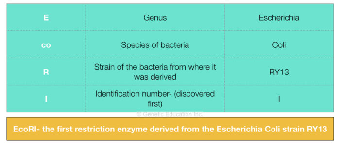 Restriction Enzymes - Teacher's Guide - The Biology Corner 3. Create a restriction enzyme that will remove the gene of interst. Give it a name too! 4. The following DNA sequence is from a virus that is dangerous, scientists want to use a restriction enzyme to cut the virus into bits. They do not need sticky ends because the do not plan to combine it with other DNA.