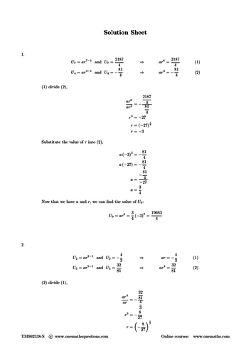 PDF 7. Geometric Sequences and Series - Mathster 3) Find the next three terms of the following sequence [2] 4) Find the 10th and the n th term of the following geometric sequence 5, 20, 80, 320, ... [1] 5) The n th term of a geometric sequence is 4 × 3 n − 2. Find the first and the 10th terms. [1] 6) The sixth term of a geometric sequence is 1215 and the third term is 45. Find the first ...