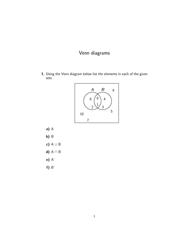 Venn Diagram Worksheets - Dynamically Created Math … These Venn Diagram Worksheets use advanced combinations of unions, intersections, relative complements and complements of sets. You may select to use standard sets, complements of sets or both. These Venn Diagram Worksheets will produce 6 Venn Diagrams for the students to shade. Name the Shaded Regions Using Two Sets Worksheet