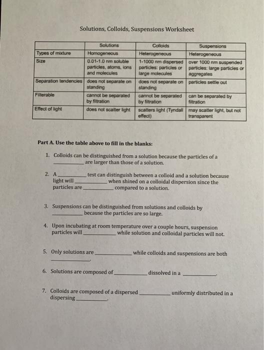 Solutions Colloids Suspensions Worksheets - Learny Kids Solutions Colloids Suspensions Displaying top 8 worksheets found for - Solutions Colloids Suspensions. PDF Solutions colloids and suspensions worksheet pdf It is between 1 nm and 100nm in diameter. difference between colloid and suspension suspension particle size solutions colloids and suspensions worksheet answer key Comparison of Solution,Suspension and Colloid 9th class Chemistry Chapter 6 Solutions online lecture EXPERIMENT. lemonade and gaseous solutions e.g. The particles are larger than ... Lesson Worksheet:Colloids and Suspensions | Nagwa A The ions in the electrolyte reduce the vapor pressure and stop the colloids from evaporating out of the liquid.; B The addition of an electrolyte changes the dispersed phase of the colloids.; C The addition of an electrolyte causes the colloidal particles to shrink.; D The ions in the electrolyte increase the solubility of the colloidal particles, converting the colloidal system into a solution.