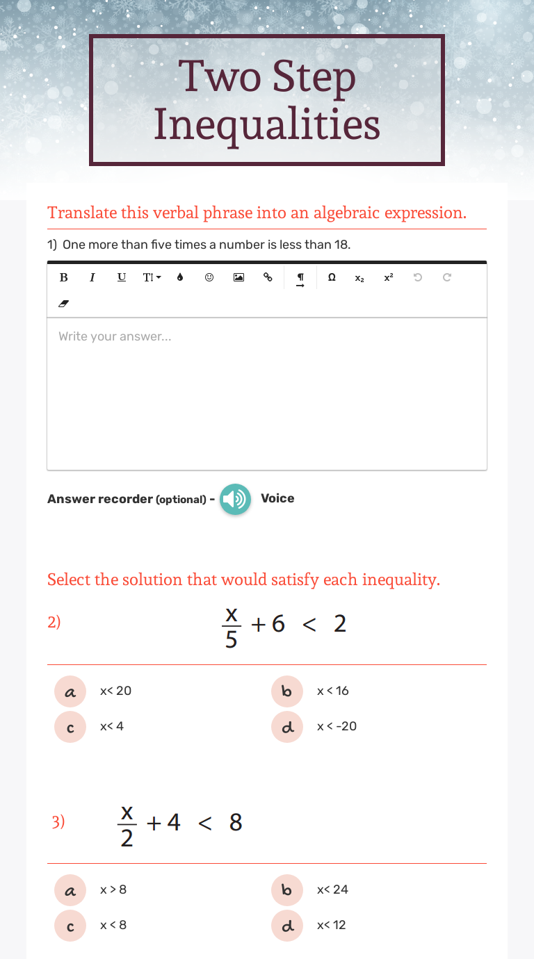 Solving Two-Step Inequalities #1 | Worksheet | Education.com Worksheet Solving Two-Step Inequalities #1 Give students practice solving two-step inequalities and graphing the solution set on a number line with this seventh-grade math worksheet! This one-page algebra worksheet progresses in difficulty from problems with integers to problems with rational numbers. How to Solve Multi-Step Inequalities? (+FREE Worksheet!) Step by step guide to solve multi-step inequalities Isolate the variable similar to equations. Simplify using the inverse of addition or subtraction. Simplify further by using the inverse of multiplication or division. For dividing or multiplying both sides by negative numbers, flip the direction of the inequality sign. Multi-Step Inequalities