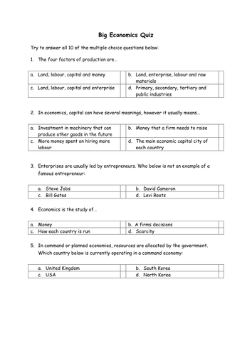 Factors of Production | Other Quiz - Quizizz Q. whats the four factors of production? Q. what is labor? the work people are paid to doto produce goods and services. all people who work for money. actions one person does for another. Q. whats a mixed economy? a market-based economy in which the government plays a role. Q. whats a market economy? the organized way a society provides goods ... PDF Factors of Production - thebusinessguys.ie quan:ty tells us how many hours this factor will be used in the producon process. The markets for factors of produc:on do however; have one defining quality that makes them different from other markets. The demand for a factor of produc:on is said to be a derived demand. This idea might best be explained by way of an example. E.g. Factors of Production | Economics Quiz - Quizizz 11 Questions Show answers. Question 1. SURVEY. 120 seconds. Q. A garbage truck driver is an example of which Factor of Production? answer choices. labor.
