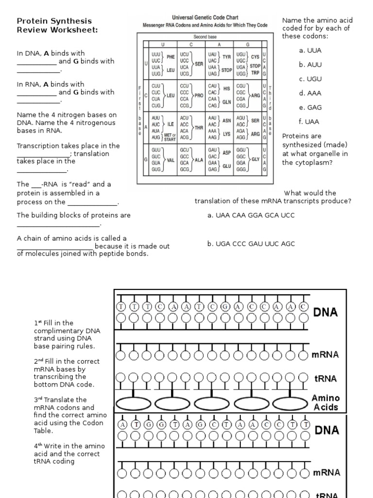 PDF Name: KEY - Mrs. Slovacek's Science Name: KEY Protein Synthesis Worksheet Directions: 1st Fill in the complimentary DNA strand using DNA base pairing rules. 2nd Fill in the correct mRNA bases by transcribing the bottom DNA code. 3rd Translate the mRNA codons and find the correct amino acid using the Codon Table 4th Write in the amino acid and the correct anti-codon the tRNA molecule. 5th The answer to the questions about protein ...