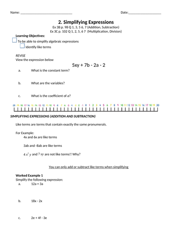 Simplify each expression worksheet answers. Combining like terms calculator - softmath Yahoo users came to this page yesterday by entering these math terms : Math equation cheats, inverse interactive games, quadratic equation graph, answers to simplifying a product of radical expressions, least common denominator in a rational expression, worksheet simple equations. Index Notation - GCSE Maths - Steps, Examples & Worksheet Example 1: finding the value of an expression involving index notation and multiplication. Simplify 3 2 × 3 3. Identify whether the base numbers for each term are the same; The base number is 3 and is the same in each term. Rational Exponents Worksheet(pdf) and Key - mathwarehouse Free worksheet(pdf) and answer key on rational exponents. 24 scaffolded questions that start relatively easy and end with some real challenges. Plus free youtube video on how to approach these problems! Combining Like Terms Worksheets - Easy Teacher Worksheets Since x and y have different variables, it is impossible to simplify this expression. Example 2. If you want to simplify this expression 3x 2 + 4x + 8y + 4x + 10x 2, here is what you will have to do: First, sort the terms so that your expression looks like this: 10x 2 + 3x 2 + 4x + 4x + 8y. Then, solve the expression so that it comes to 13 x 2 ...