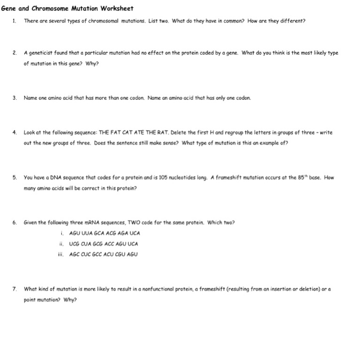 Gene and Chromosome Mutation Worksheet.docx - Course Hero Gene and Chromosome Mutation Worksheet 1. There are several types of gene mutations. List two. What do they have in common? How are they different? 2. A geneticist found that a particular mutation had no effect on the protein coded by a gene. What kind ofmutation was this? Why? 3. Name one amino acid that has more than one codon. 13.3 Mutations ( bio worksheet answers) Flashcards | Quizlet mutation a mutation that produces an extra copy of all or part of a chromosome duplication a chromosomal mutation that reverses the direction of parts of a chromosome inversion a kind of mutation that can change every amino acid that follows the point of mutation frameshift mutation the addition of a base to the DNA sequence insertion