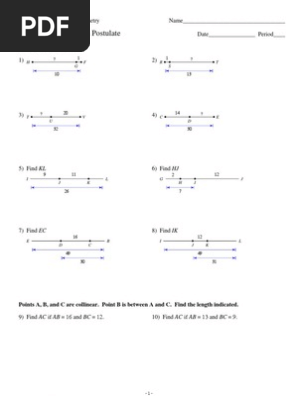 Geometry segment addition postulate worksheet answers. PDF Geometry basics segment addition postulate worksheet answer key - Weebly to find the segment area, use the radii from the endpoints to form a triangle. = triand - answer key segment addition postulate point b is a point of segment ac, ie b is between a and c if and only if ab + bc = ac construction from a given point of (or not on) a line, one and outside angle the measurement of an outside angle of a triangle is … PDF 1.10 Segment Addition Postulate ACADEMIC Worksheet Name Period 1.10 Segment Addition Postulate ACADEMIC Worksheet Name_____ Period Segment Addition Postulate If B is between A and C, then AB BC AC ... then B is between A and C. Write the Segment Addition Postulate for each problem. Also use Segment Addition Postulate to solve the following problems. 1. If AB = 12 and BC = 7, then find the length of AC. A B ... 9+ unit 1 geometry basics homework 2 answer key pdf most view 1.Unit 1 Geometry Basics Homework 2 Segment Addition Postulate …. Descriptions: This is a physical and chemical properties and changes worksheet answers pdf ready for download. Contact me if you have any questions regarding this physical …. Unit 1 Geometry Basics Homework 2 Segment Addition Postulate Answers Brass 10. Oxygen 11. Italian Salad Dressing 12. Salt Water 13. Raisin Bran 14. Silver 15. Lithium Iodide 16. Apple Pie 17. Kool Aid 18. Sugar Water 19. Chocolatechip Cookie 20. Gatorade 21. Gold 22. tacos 23.Lead 24. Ceasar Salad 25. Calcium 26. Whole Milk 27. Skim Milk 28. hydrogen peroxide 29. Potassium 30. Sugar 31.