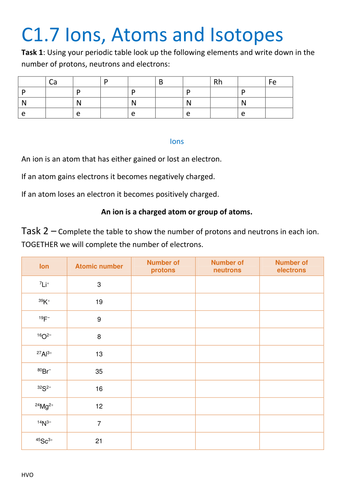 Atoms Isotopes And Ions Worksheets & Teaching Resources | TpT Students work with ions, isotopes, and atoms. Students use the periodic table and information on the worksheet to determine the number of protons, neutrons, and electrons for each one. They also must determine if the atom is an ion, isotope, or neutral atom. Optional hands-on component included
