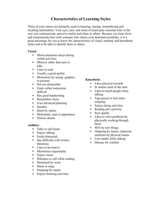Kinesthetic Learning Style: Traits and Study Strategies - ThoughtCo 11/09/2018 · Often, those with a kinesthetic learning style have a hard time learning through traditional lecture-based schooling, because the body does not make the connection that they are doing something when they're listening without movement. Their brains are engaged, but their bodies are not, which makes it more difficult for them to process the information.