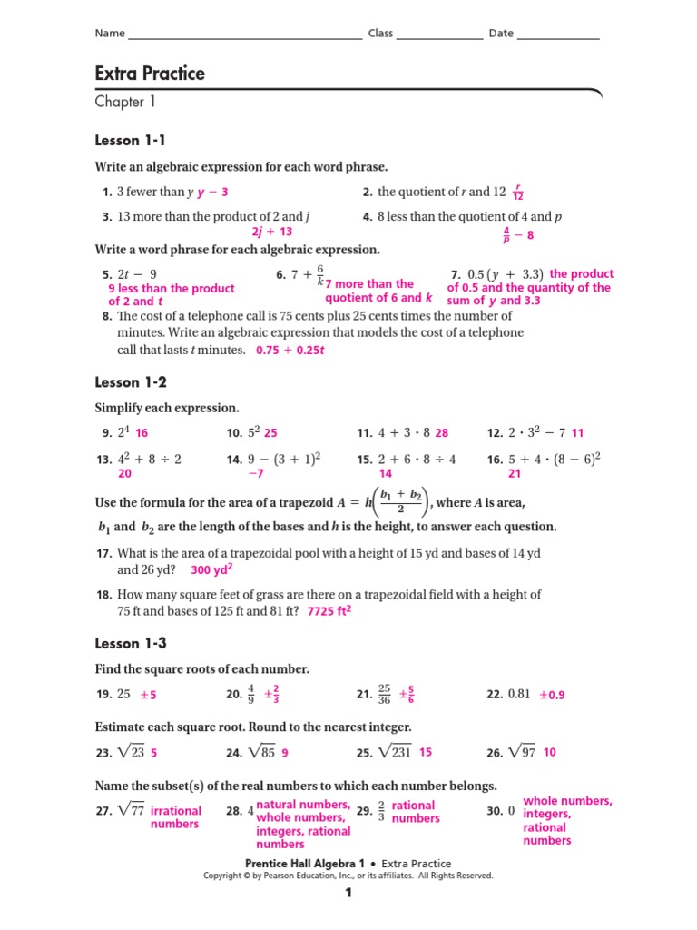 Spring Notes - Mrs. Snow's Math These notes follow the Prentice Hall Algebra II Texas ... Review Answers (fall 2014) Test Review (fall 2013) Review Answers (fall 2013) Chapter 1 Tools of Algebra. Lesson 1 Part 1 Properties of Real Numbers. ... Homework Worksheet . Lesson 7-1 Roots and Radical Expressions.
