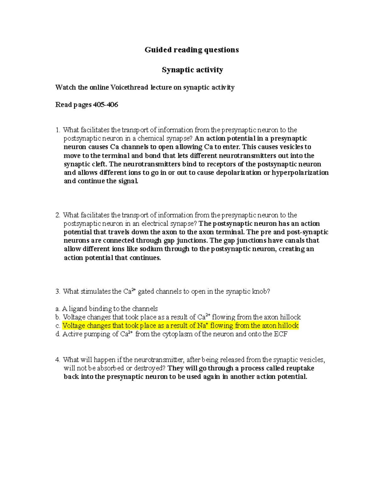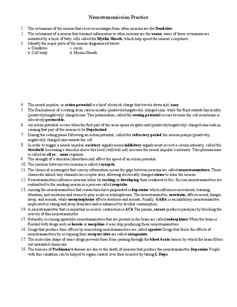 Neurotransmission practice worksheet answers